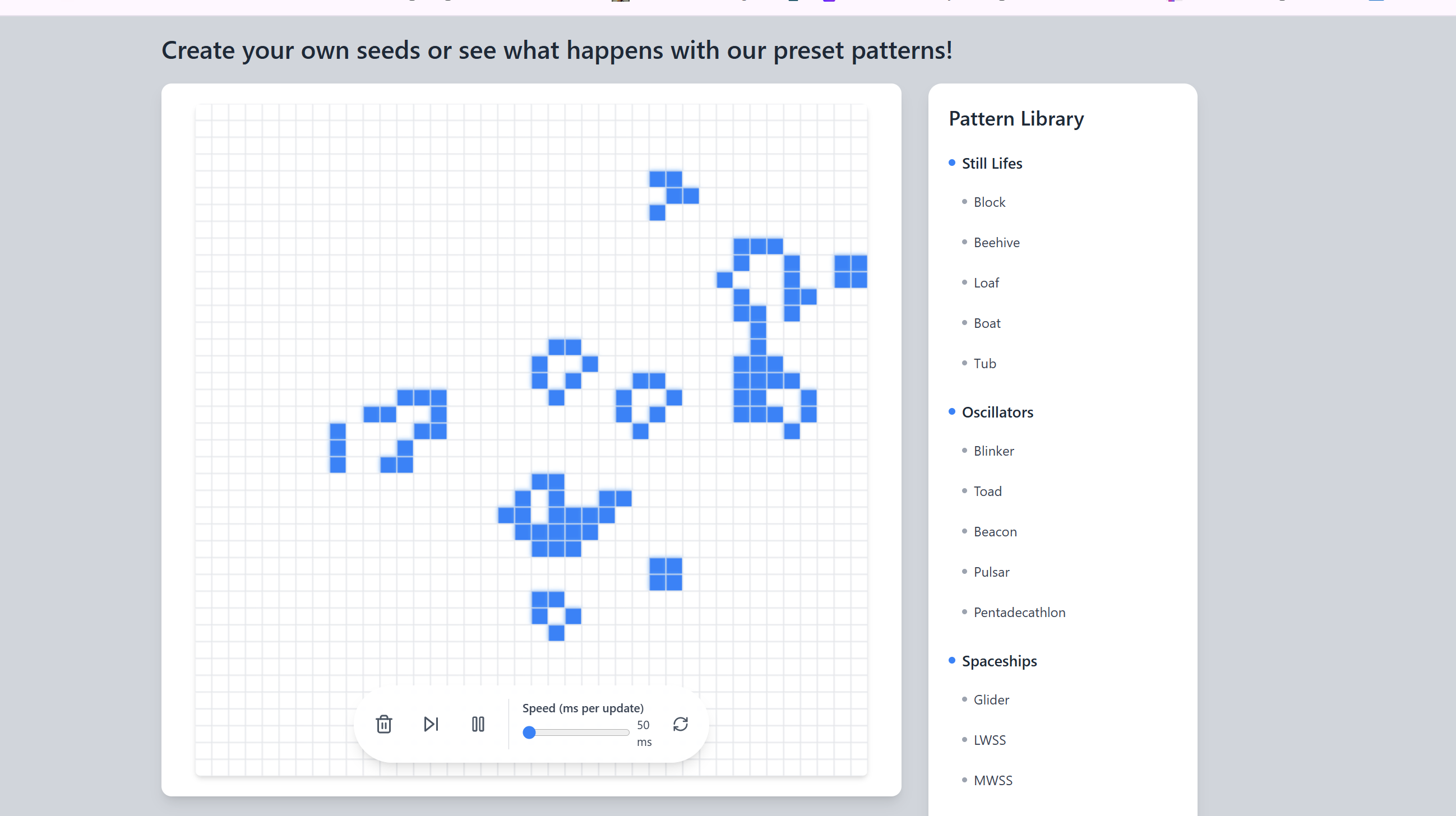 Watch cells come alive on a grid, following simple rules that create surprisingly complex patterns. Optimized for smooth animations on large grids.